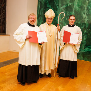 „Du willst Menschen, die dir folgen auf dem Weg, der Leben heißt.“ – In einem feierlichen Gottesdienst in der Kapelle im Priesterseminar am 8. Jänner wurden Herbert Tomaschek und Thomas Lang von Bischof Wilhelm Krautwaschl zum Lektoren- bzw. Akolythendienst beauftragt.
