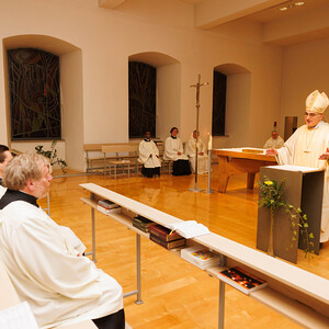 Auf dem Weg der Nachfolge lässt man sich aber immer mehr und mehr in das Lebensgeheimnis Jesu ein. Es sei nicht nur ein Nachahmen, sondern „ein sich selbst in die Fußstapfen Jesu begeben, in dem Seine Lebensart immer mehr zu der eigenen wird.“ Der Bischof wies darauf hin, dass der Maßstab sei, ganz für die Menschen, mit denen man unterwegs ist, zu leben. Sein Wunsch: „Wenn du, Thomas, heute zum Dienst als Akolyth beauftragt wirst, dann ist dies nicht bloß der offizielle Auftrag der Kirche, die Kommunion zu spenden oder liturgische Dienste auszuüben. Es geht um den innersten Kern christlicher Berufung, den zu vertiefen Du Dich auf den Weg gemacht hast. Lass möglichst viele daran teilhaben!“