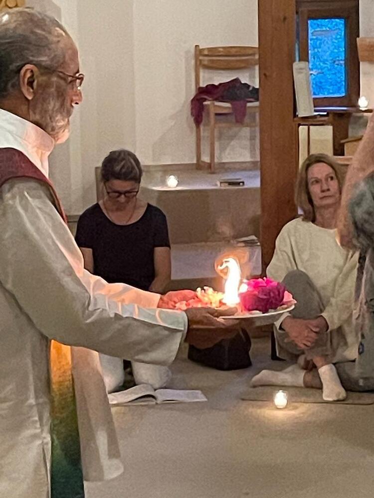 Die Bhagavad Gita, die im Mittelpunkt des stärkenden, sechstägigen Meditationskurses mit P. Sebastian Painadath SJ im Haus der Stille stand (1.6.-6.6.2023), gehört zu den angesehensten und am weitesten verbreiteten Texten der indischen Spiritualität. Pater Sebastian Paindanath SJ verdeutlichte mit den 42 Teilnehmenden die Parallelen zwischen dem spirituellen Gedicht (verfasst zw. dem 5. und dem 2. Jhd. v. Chr.) und dem Johannesevangelium, das die Urquelle der christlichen Mystik in dem Sinne darstellt, dass Jesus Christus die Menschen einlädt, an seiner Erfahrung der Einheit mit dem göttlichen Grund (dem Vater) teilzuhaben.