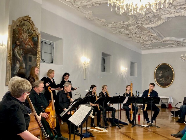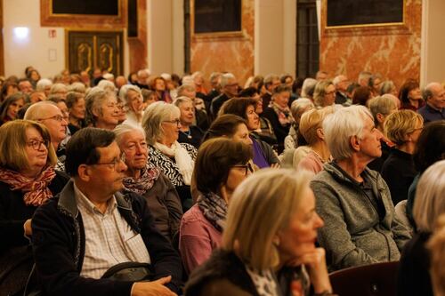 Umrahmt und thematisch gestützt wurde die Lesung durch das St.-Thomas-Consort des Johann-Joseph-Fux-Konservatoriums (Fachbereichs ,Alte Musik‘, Leitung: Claire Pottinger-Schmidt), das Auszüge aus seinem Konzertprogramm ,Da pacem‘ zum Besten gab: Mit Barock- und Renaissanceklängen von Thomas Crécquilon, Cristoforo Caresana sowie Rognoni Taeggio vermittelte das elfköpfige Ensemble die menschliche Trauer um das Verlassensein vom Glück in Kriegszeiten sowie die zeitunabhängig Botschaft vom notwendigen Frieden.