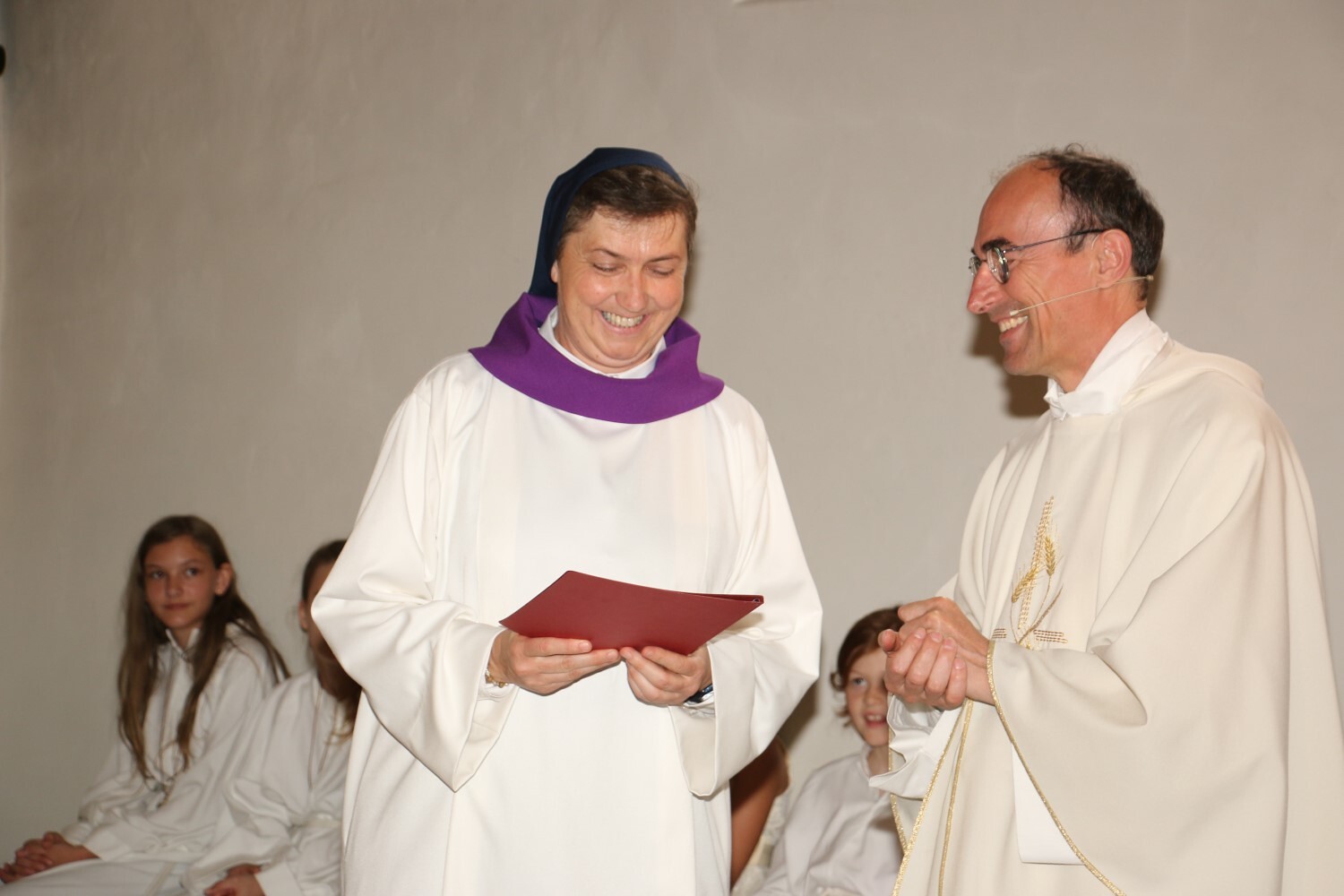 Pfarrer Johann Karner überreicht Sr. Maria das Dekret zur Wort-Gottes-Feier-Leiterin. Sie trägt erstmals eine weiße Albe.
