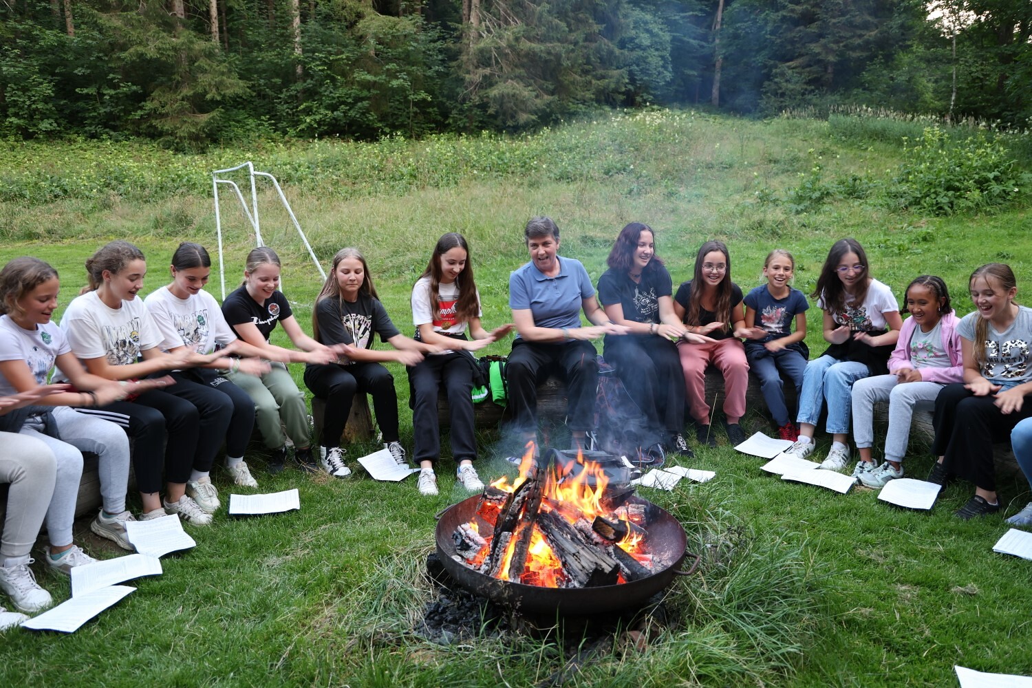 Lustige Lieder werden rund um das Lagerfeuer gesungen.