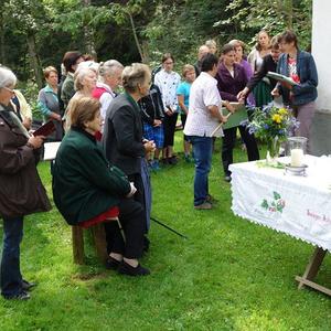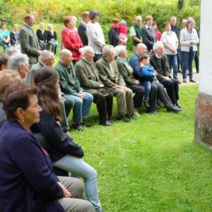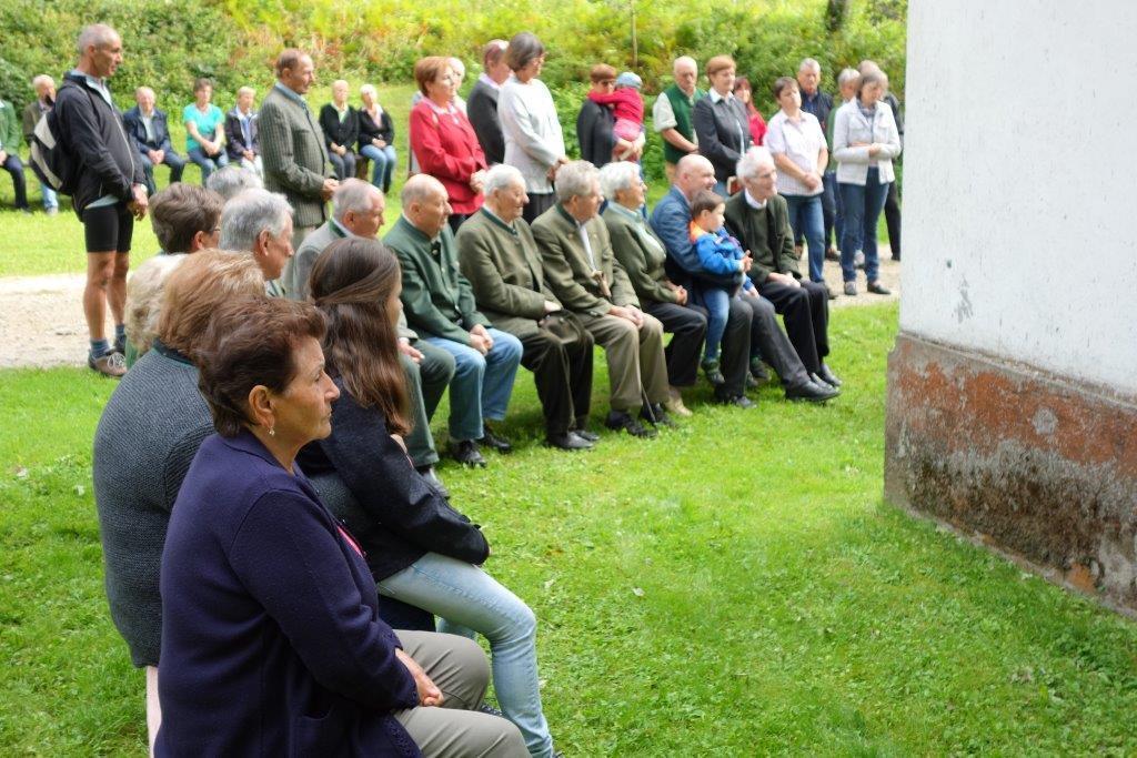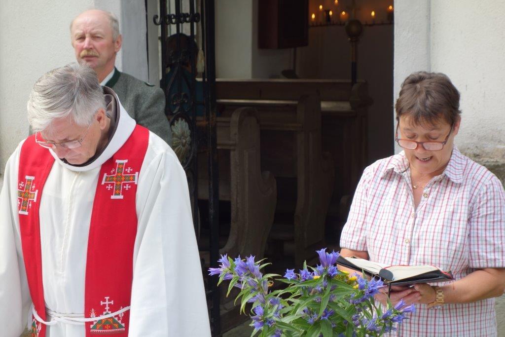 In Vertretung des Fußwallfahrers P. Simon zelebrierte Franziskaner-Guardian P. Josef Höller aus Graz in launiger Weise die Eucharistie, zu der rund 80 Gläubige bei herrlichem Wetter zu Fuß, mit den Fahrrädern oder per Auto gekommen sind.