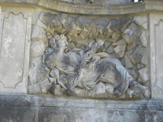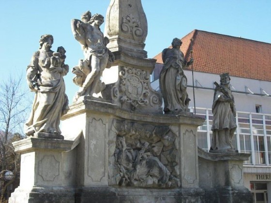 Im unteren Teil sind Sandsteinfiguren des Nährvaters Jesu und Bräutigams der Gottesmutter, Joseph von Nazaret, mit dem Jesuskind im Arm zu sehen, weiters die Pestpatrone Märtyrer Sebastian mit Pfeil durchbohrter Brust und Pilger Rochus von Montpellier mit der Pestbeule am Oberschenkel sowie Johannes Nepomuk mit dem Kruzifix in der Hand, dem in der Kirche ein eigener Altar gewidmet ist. In der Mitte sieht man die heilige Einsiedlerin Rosalia von Palermo in einer Höhle, ebenfalls eine Patronin gegen die Pest, die bis zu ihrem Tode in einer Grotte auf dem Mont Pellegrino lebte.