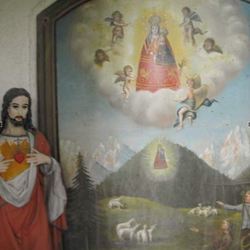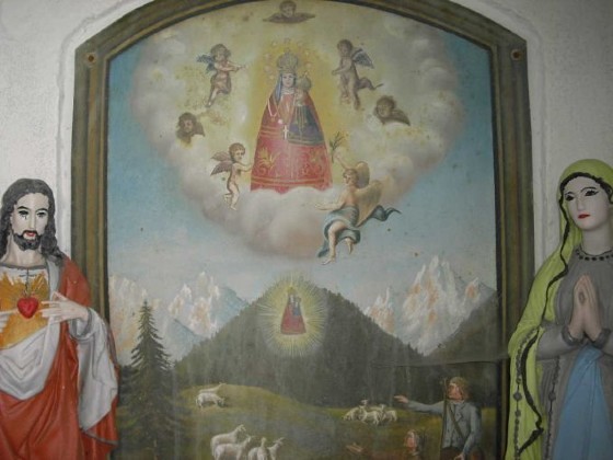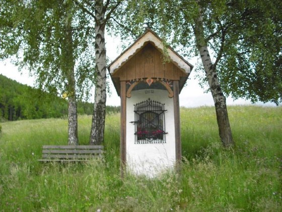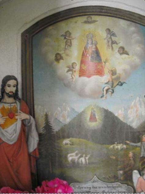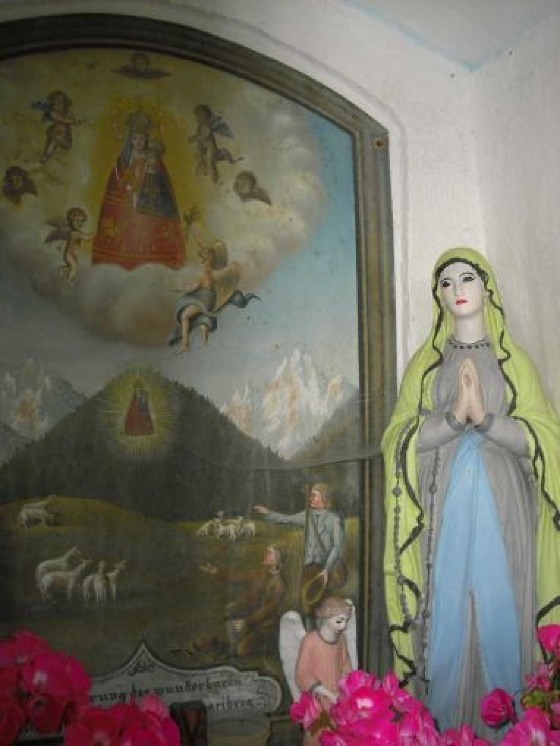 Das Sigl-Kreuz besteht aus einem stabilen Steinbau und ist mit einem Holzvordach und einem Schindeldach gedeckt, das 2005 von den Besitzern komplett erneuert werden musste. Im Inneren sieht man ein Bild vom „Ursprung des wunderbaren Gnadenbildes Maria Luschariberg“. Der Luschariberg befindet sich im österreichisch-italienischen Grenzgebiet unweit der Gemeinde Tarvis im Kanaltal. Maria Luschari ist heute ein berühmter europäischer Wallfahrtsort auf einem Aussichtspunkt, der einen herrlichen Blick auf die imposanten Berge der Gegend bietet und neben dem Pilgerweg auch durch eine Seilbahn erschlossen ist. Eine alte Überlieferung berichtet, dass dort im Jahr 1360 einem Hirt die Schafe weggelaufen waren. Kurz darauf fand er sie, kniend in einem Bergkieferstrauch. Verblüfft näherte er sich und sah im Strauch ein hölzernes, reliefartiges Bild der Gottesmutter mit dem Kind Jesu. Er brachte das Bild dem Pfarrer. Doch am nächsten Tag war das Bild auf wunderbare Weise wieder am Luschariberg, und wieder umgaben es kniende Schafe. Der Fall wiederholte sich noch ein drittes Mal. Da meldete der Pfarrer die Begebenheit dem zuständigen Patriarchen. Der gab die Anordnung, dass an der Stelle, wo das Bild gefunden wurde, eine Kapelle gebaut wird. An dieser Stelle, an der heute die Wallfahrtskirche thront, wird die heilige Maria als „Königin Europas“ verehrt.
