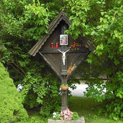 Das hölzerne Kreuz besteht aus zwei sich rechtwinkelig schneidende Balken, das Satteldach ist mit Schindeln gedeckt und über dem Corpus ist farbiges Bild von Maria mit dem Jesuskind angebracht. Im Christentum wurde das Kreuz durch den Kreuzestod Christi zum Sinnbild des Leidens und seiner Auferstehung. Am Fuße dieses religiösen Zeichen dient ein kurzer ausgehöhlter Baustamm als Blumenkistchen. Dieses Kreuz wurde vermutlich deswegen aufgestellt, da ohne Glauben an Christus und die Schöpfung kein Hof komplett ist.