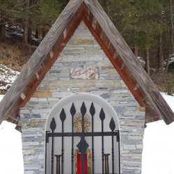 Das Bauwerk in einem tabernakelartigen Aufbau wurde von einem Hobbysteinsammler in Graz mit schmalen Steinen rasch realisiert, nach Schrems transportiert und auf dem vorgefertigten Betonfundament neben einem Apfelbaum aufgestellt.