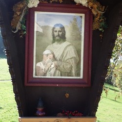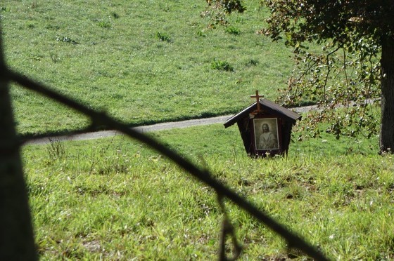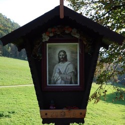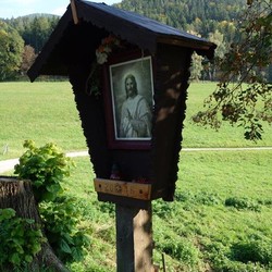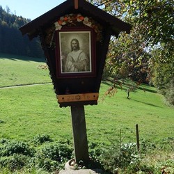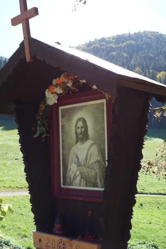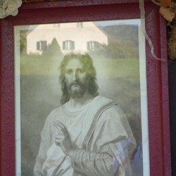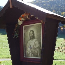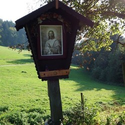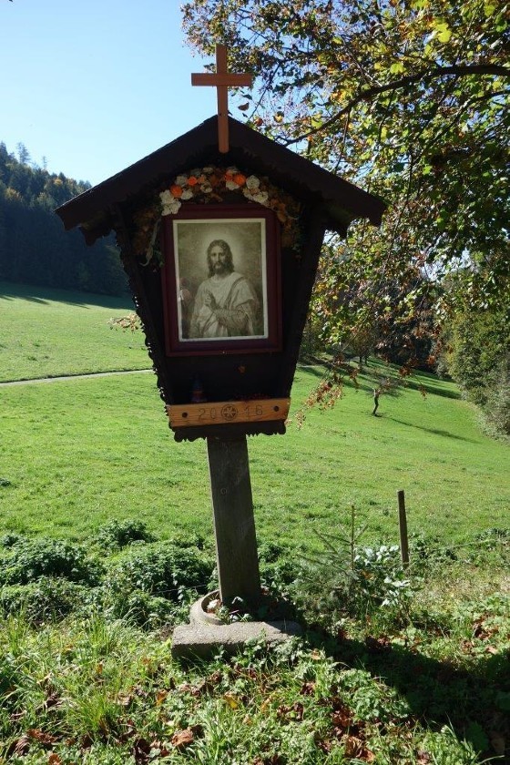 Anstelle der Skulptur befindet sich jetzt an diesem Wegkreuz ein Andachtsbild, das den segnenden Jesus zeigt, der die Vorübergehenden mit seinen Augen begleitet. Dieses wunderbare Bild erwarb Frau Pfeilstöcker auf einem Flohmarkt.