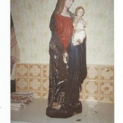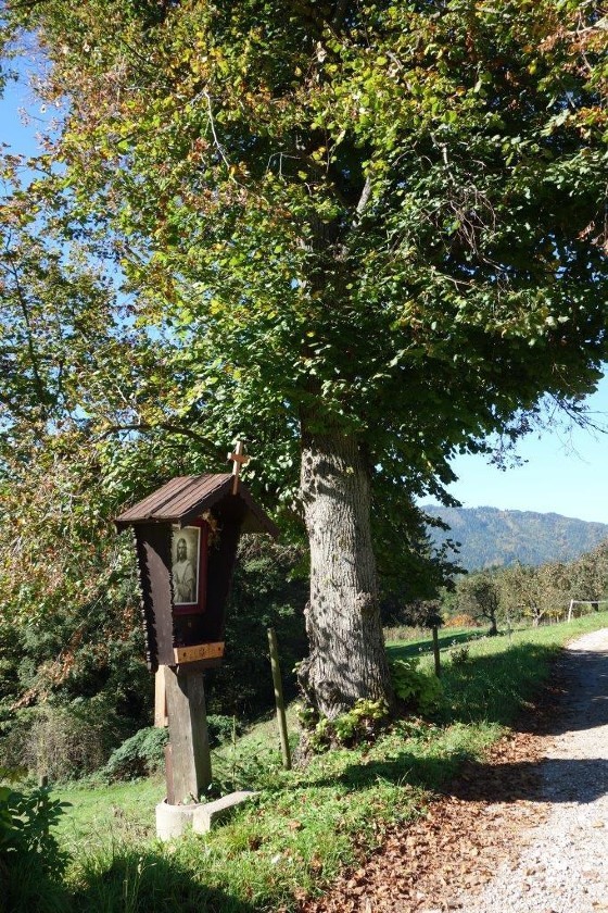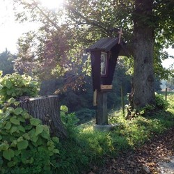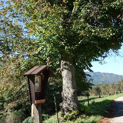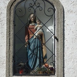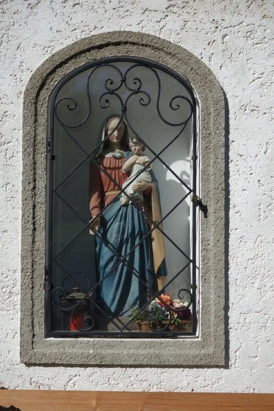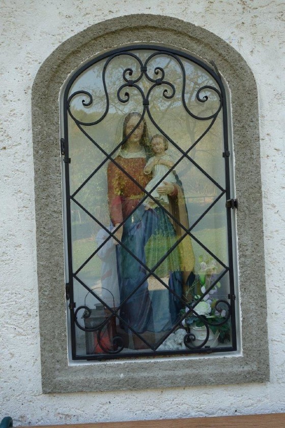 Ursprünglich stand dieses religiöse Kleindenkmal zwischen zwei mächtigen Linden und beherbergte eine schöne ein Meter hohe Skulptur von Maria mit dem Jesuskind im Arm, geschmückt mit Seidenblumen, Kerzen und Gestecken.