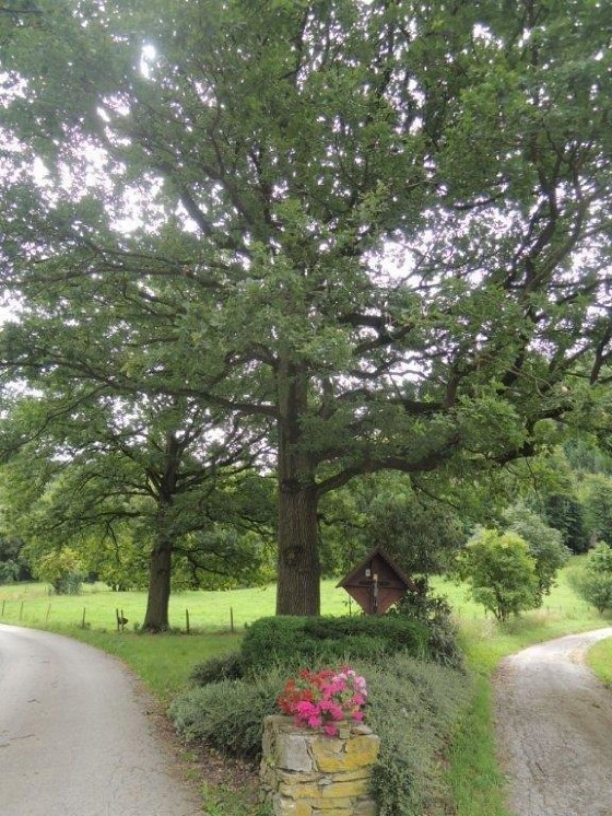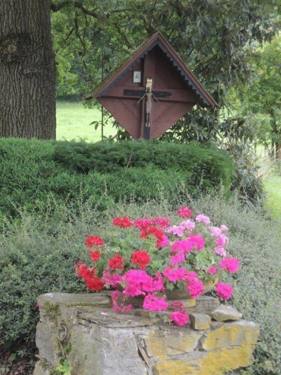 Ursprünglich stand dieses Zeichen des Glaubens in der Nähe der Ruine Pfannberg. Im Auftrag der Familie Mayr-Melnhof-Saurau wurde dieses im Gedenken an den in Italien bei einem Autounfall verunglückten und am 14. Juni 1993 in München verstorbenen Baron Dr. Franz von Mayr-Melnhof-Saurau (geboren am 22. Februar 1949 in Wien) unter einer mächtigen Eiche am Pichlhof aufgestellt. Davon zeugt eine am Glaubenssymbol angebrachte Parte: