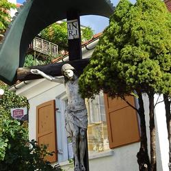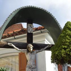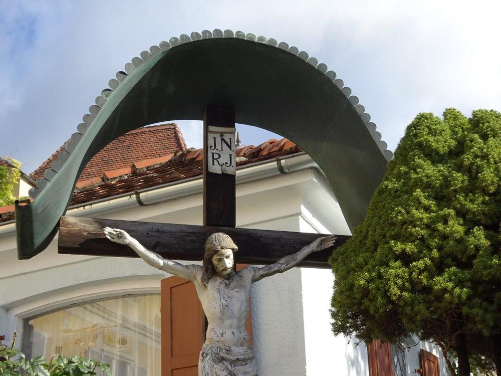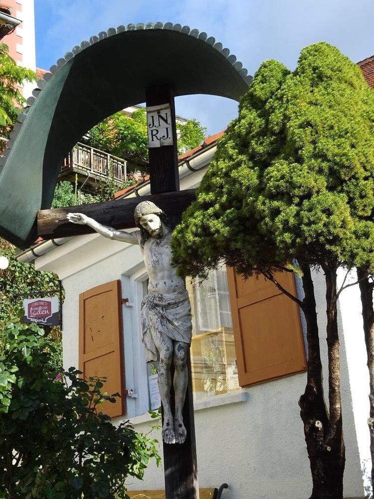 Dieses Holzkreuz mit der künstlerischen Darstellung des gekreuzigten Christus und einem halbkreisförmigen schützenden Blechdach musste anlässlich des Neubaues der Betonbrücke 1981 auf die gegenüberliegende Seite an den Taboraufgang versetzt werden. Dort steht es jetzt hinter einem Stadtbrunnen in einer Blumeninsel.