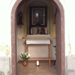 Über dem Eingangstor befindet sich ein vierfärbig verglastes Rundfenster, durch das Licht auf die Mariendarstellung fällt, und von den Seiten lassen zwei vergitterte und mit Blumenkisterln geschmückte Rundbogenfenster die Helligkeit auf den Fliesenboden herein. Rund um die Kapelle wurden Steinplatten verlegt und das Ziegeldach wird von einem wunderbaren gusseisernen Kreuz gekrönt.