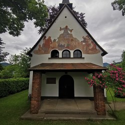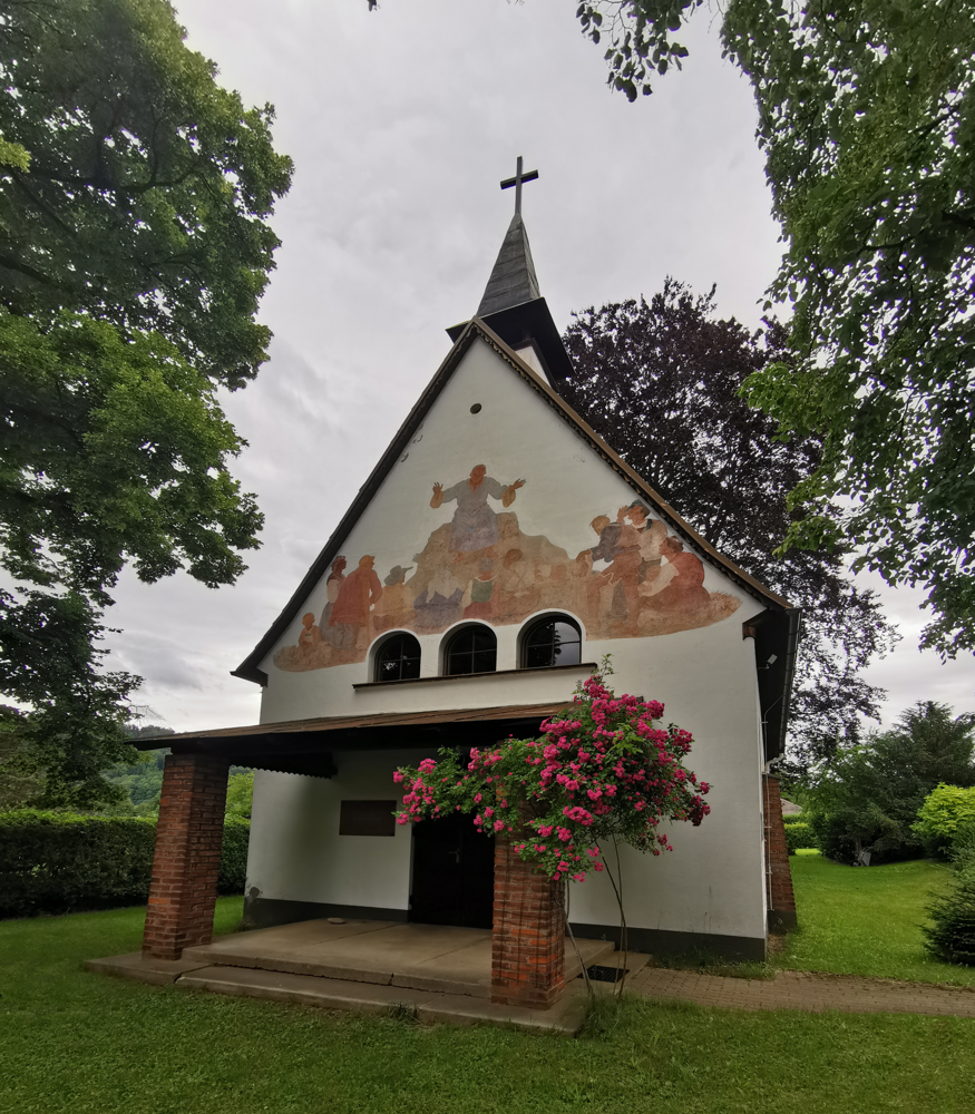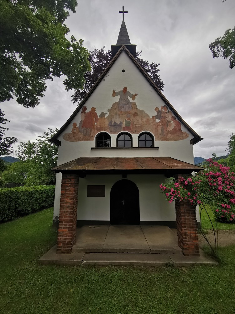 Das Fresko über dem Eingang stammt vom ehemaligen Benediktinermönch Switbert Lobisser (1878-1943) und zeigt Jesus bei der Bergpredigt. Die Menschen, die Jesus zuhören, sind in steirischer Tracht dargestellt.