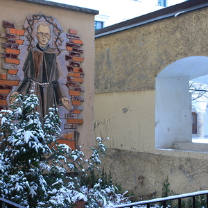 Im südlichen Seitenschiff der Mariahilferkirche zeigt die eine Skulptur der Künstlerin Aloisia Ulman aus dem Jahr 1983 den Ordensheiligen Maximilian Kolbe. Am westlichen Ende des Kreuzgang gegenüber des Eingangs zur Sakristei findet sich ein weiteres Denkmal.