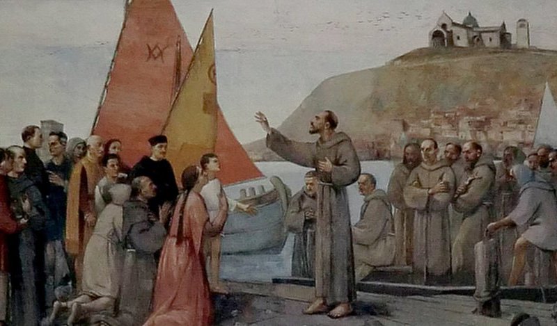 Fresko: Franzsikus und seine Brüder Abreise ins Heilige Land, im Santuario Joseph von Copertino in Osimo | Foto: Joachim Schäfer - <a href="https://www.heiligenlexikon.de">Ökumenisches Heiligenlexikon</a>