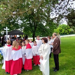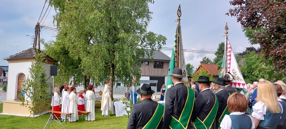 Im Anschluss an die Hl. Messe, zelebriert von Vikar Gerhard Hatzmann und begleitet von Kantorin, Lektoren und liturgischen Diensten beider Pfarren, fand eine Andacht bei den vier Stationen am Dorfplatz statt. Für die kleine Prozession waren vier Brottische als Altäre gerichtet, als Sinnbild für die vier Himmelsrichtungen und dafür, dass Christus der Heiland der ganzen Welt ist. Im gemeinsamen Liedruf "Brot des Lebens" zogen die liturgischen Dienste und die Kinder stellvertretend für das Volk Gottes zu den vier Altären: Brot der Liebe – Brot der Versöhnung – Brot des Friedens – Brot der Hoffnung. Zum Abschluss erteilte Vikar Hatzmann den Eucharistischen Segen, verbunden mit der Einladung, das Allerheiligste gemeinsam zur Kirche zu begleiten. Die Feier schloss mit dem gemeinsam gesungenen "Te Deum" ab. Zu den Feierlichkeiten waren auch die Vereine wie Feuerwehr und ÖKB eingeladen.