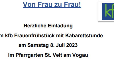 KMB Pilgerwanderung Herzliche Einladung zur schönen KBM-PILGER-WANDERUNG: KAPELLENWEG-WIES (Dies ist eine Veranstaltung des Seelsorgeraumes Südsteirisches Weinland) Wann: Samstag, 01. Juli 2023, bei jeder Witterung (nur bei Starkregen gibt es einen Ersatztermin) Abfahrt um: 09.00 Uhr, vom Kirchplatz St. Veit am Vogau Treffpunkt in Wies: 10.00 Uhr, Parkplatz Friedhof (linke Seite vor der Kirche) mehr: KMB Pilgerwanderung